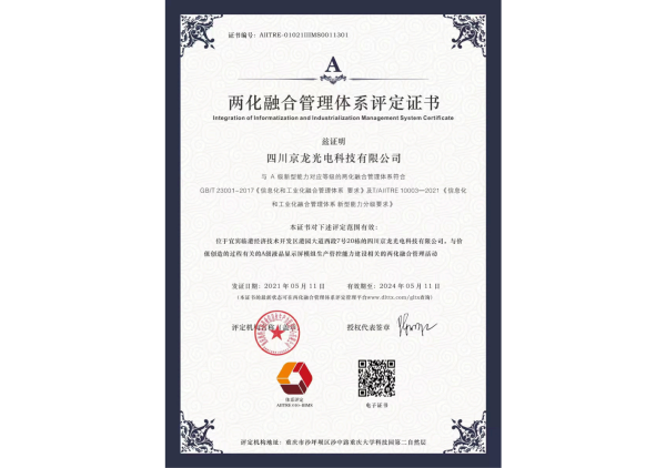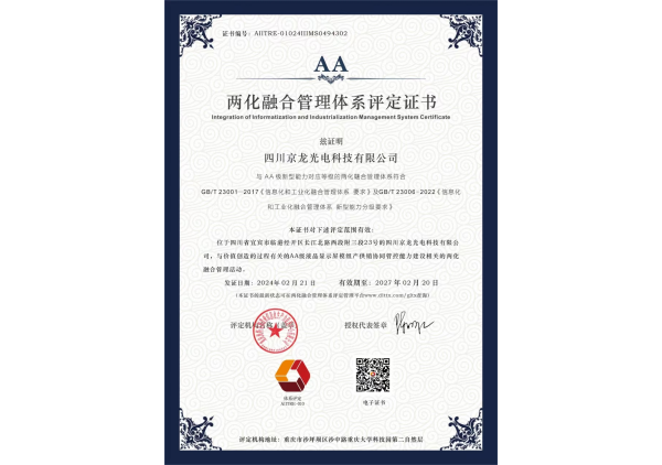 兩(liǎng)化融合管理體係評定AA級(jí)證書