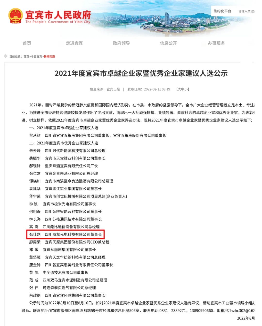 近日,宜(yí)賓市人民政府公示了2021年度宜賓市卓越企業家暨優秀企業家建議人選,表彰立足(zú)本土、專注實業,為推進全市經(jīng)濟持續健康較快發展(zhǎn)作出了突出貢獻的卓越企業家和優秀企業家(jiā)。四川京(jīng)龍光電科(kē)技有(yǒu)限公司董事長張仕剛榮獲2021年度(dù)宜賓市“優秀企業家”榮譽稱號,連續2年獲此殊榮!